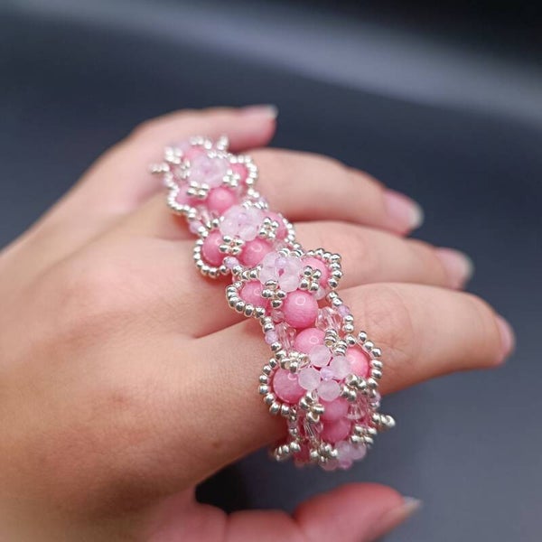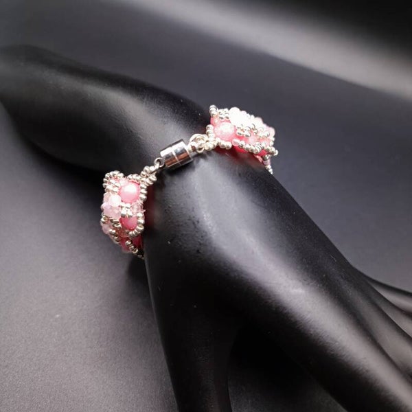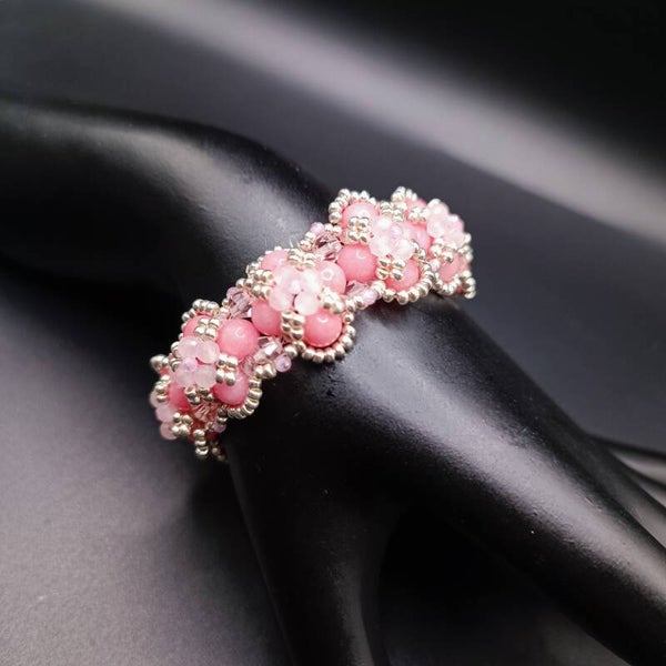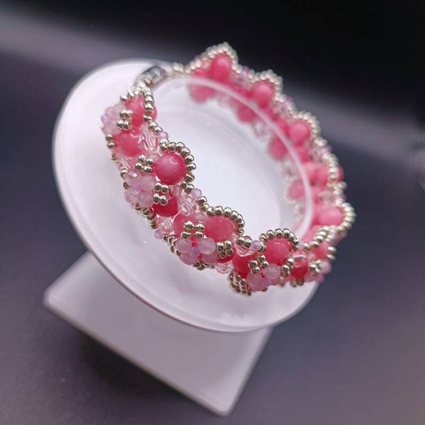 Bracelet tissé en Quartz Fraise, Quartz Rose, Spinelle et Perles Miyuki