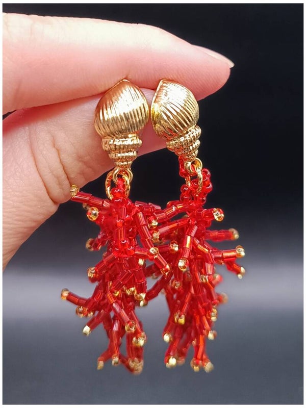 Boucles d'oreilles Clous Rouge et Doré tissées Brick Stitch en Perles Toho