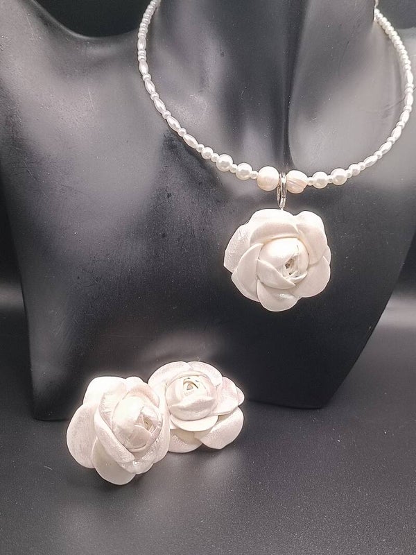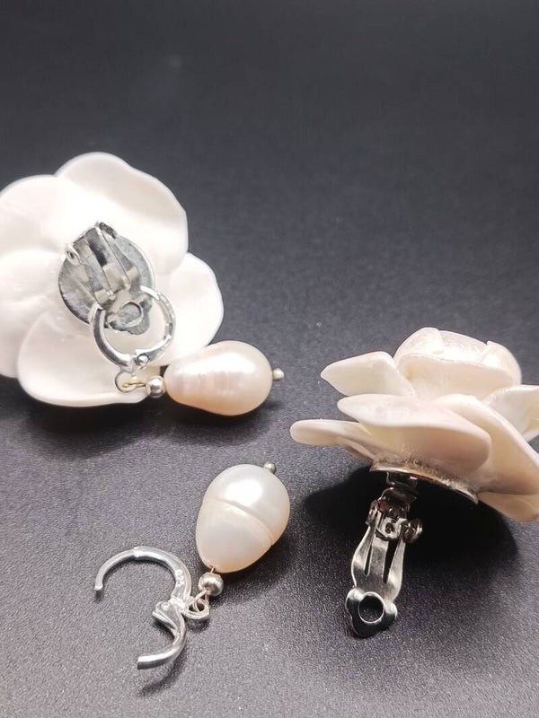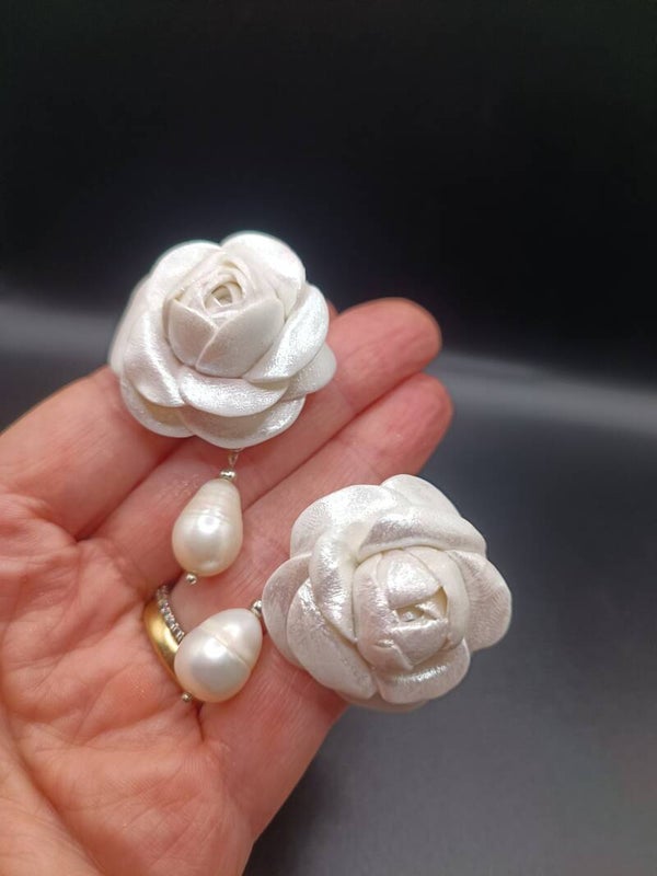 Boucles d'oreilles Clips "Camélia classique Chanel" Blanc Nacrée en Cernite - Boucles d'oreilles Clips "Narcisses Copper Queen'" en Cernit - pâte polymère