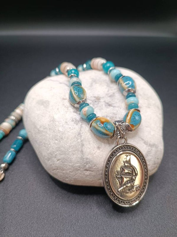 Collier Bohème Homme en Jaspe Ocean, Howlite et Coquillage blanc naturel