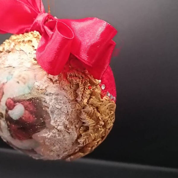 Boule de Noel Artisanale en velours Rouge & Dorée décorées de moulures d'art et découpage