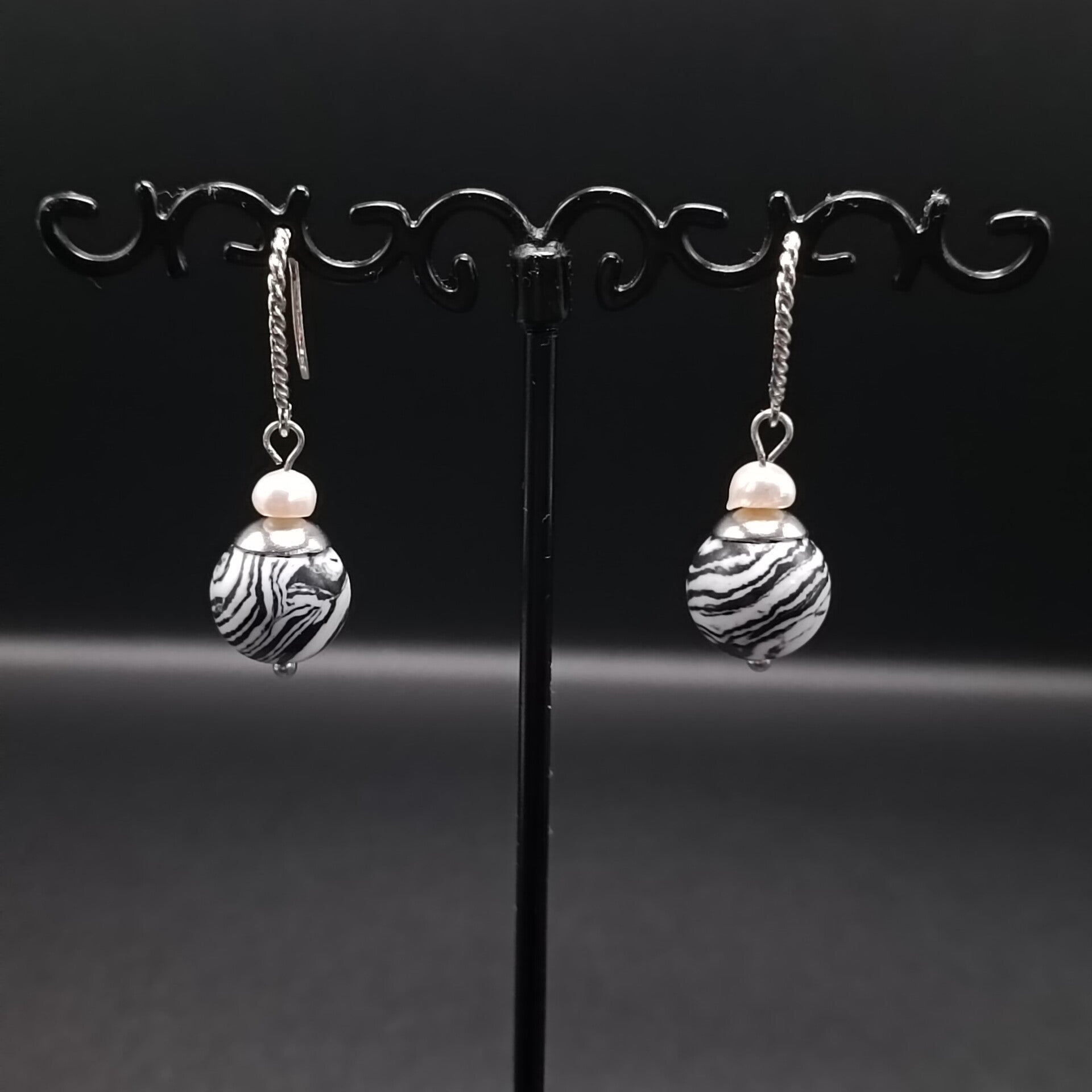 BOUCLES D'OREILLES en JASPE ZEBRE 10 mm NACRE BLANCHE