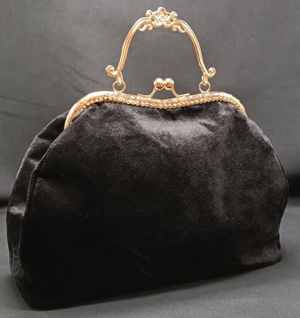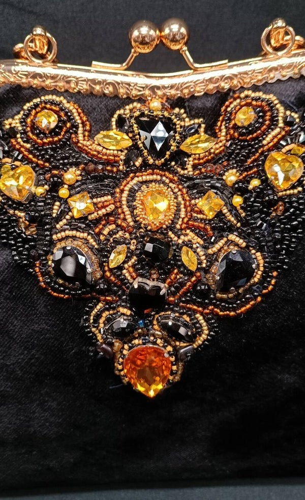 Sac à main de Soirée "Nuit Dore" en velours Noir brodée en perles japonaises, Cristaux et pierres natureles Onyx avec cadenas Kiss