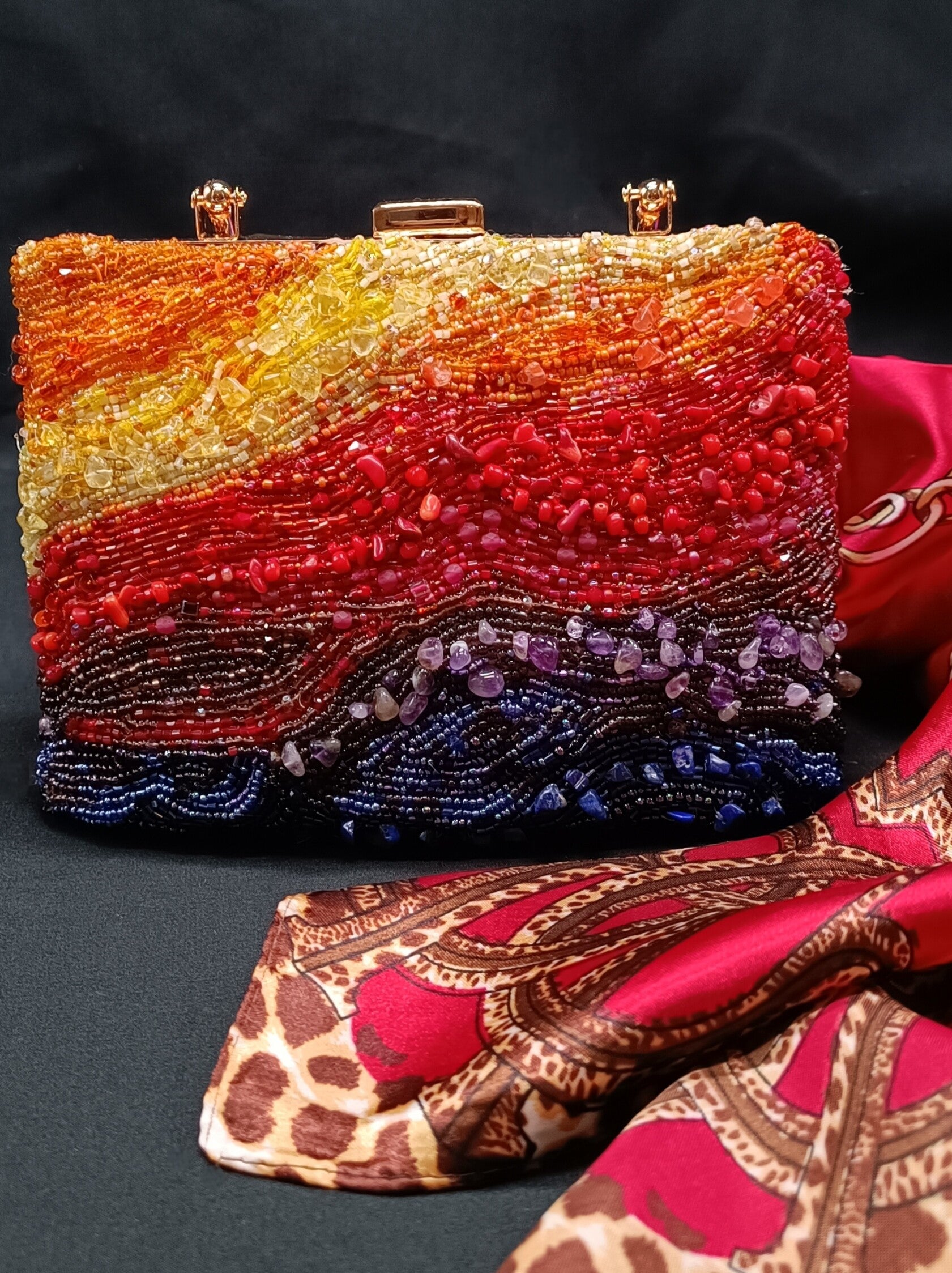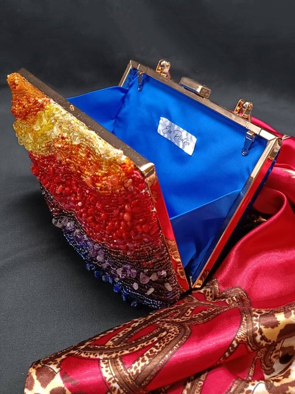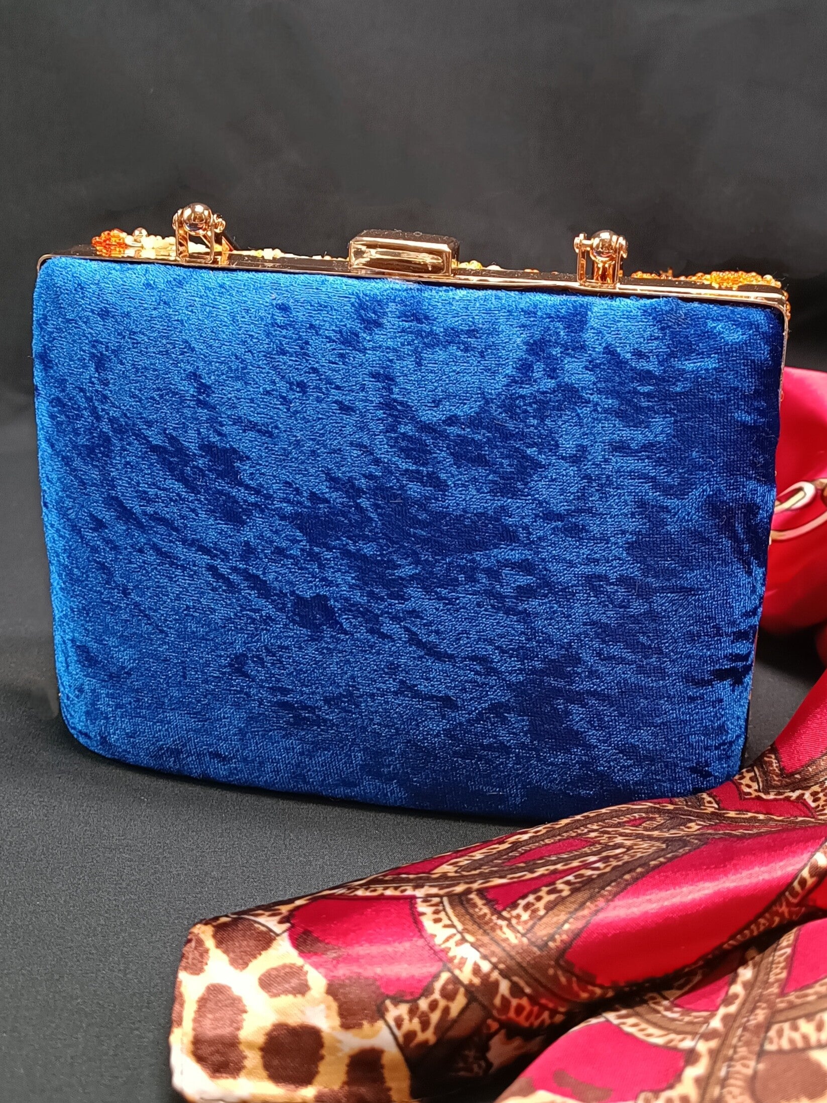 Sac de Soirée Minaudiére Clatch en velours Blue brodée en perles et pierres natureles avec fermoir Clapet Dore