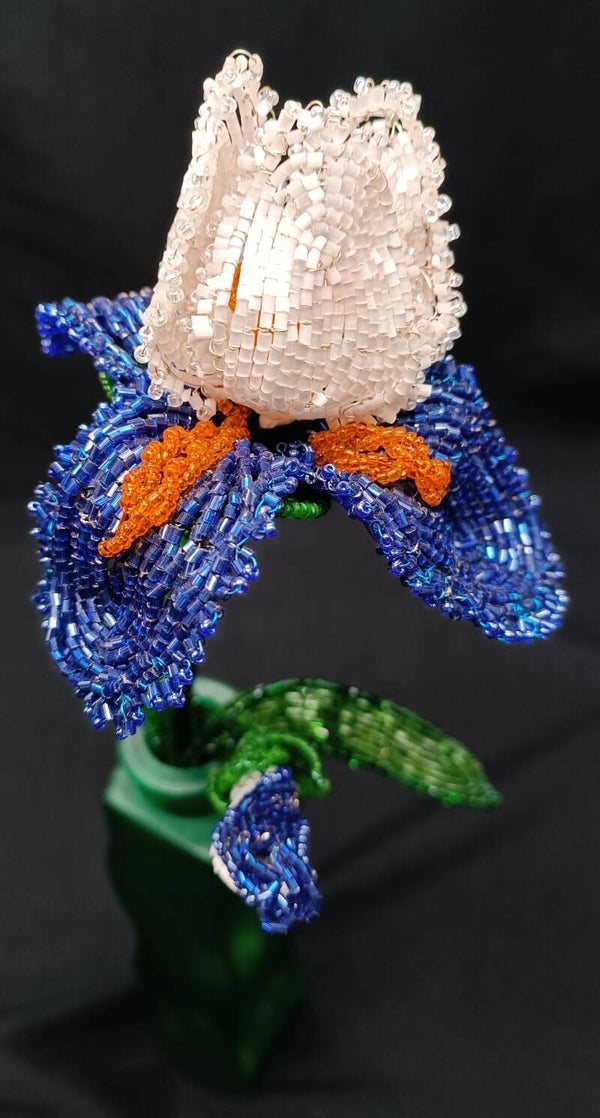 Fleur Iris Bleue en Perles rocailles et fil de fer tordu