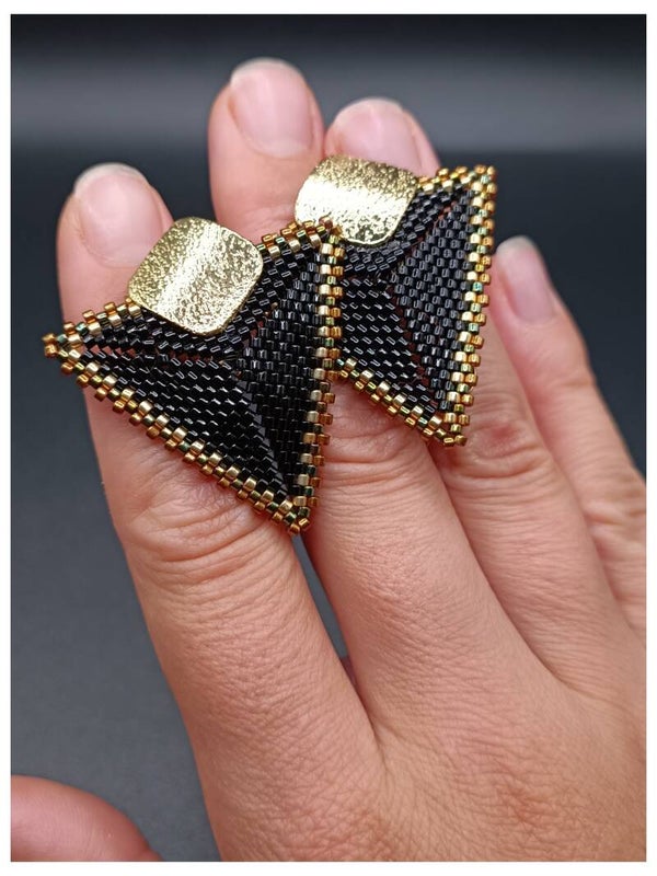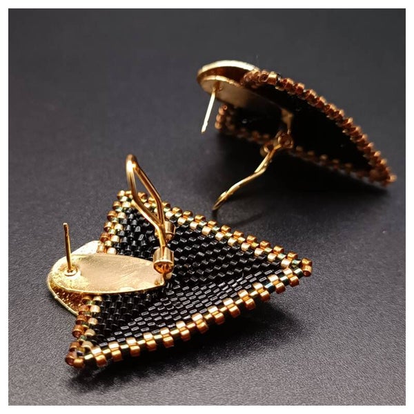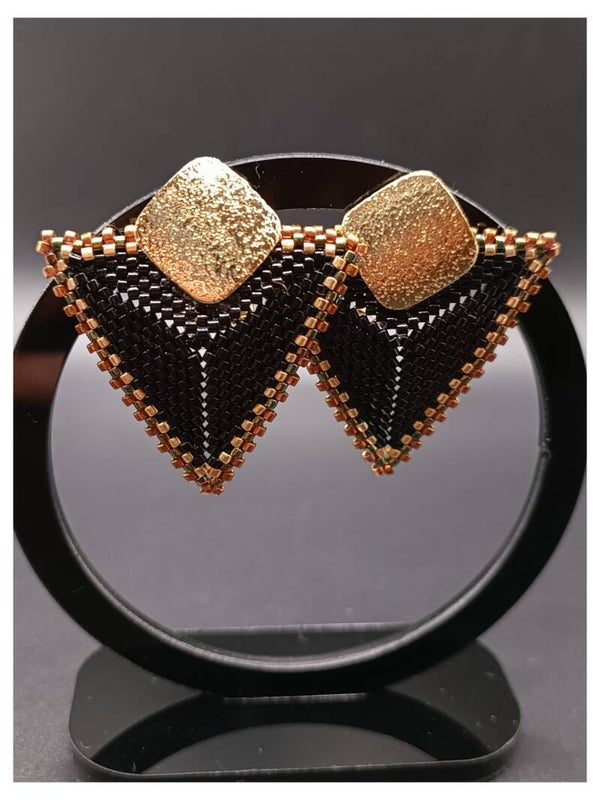 Boucles d'oreilles Clous Noir et Doré tissées Brick Stitch en Perles Miyuki Delika